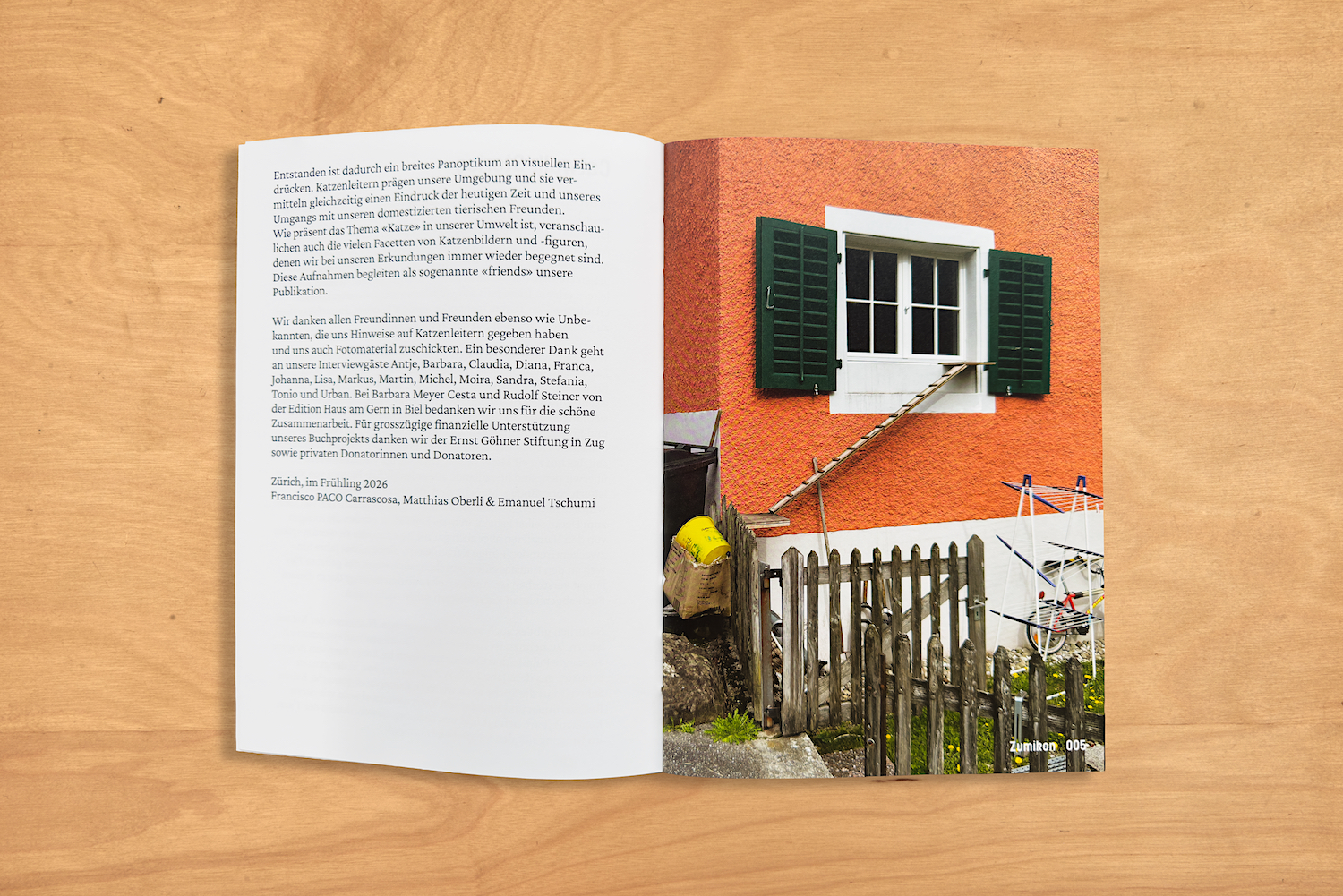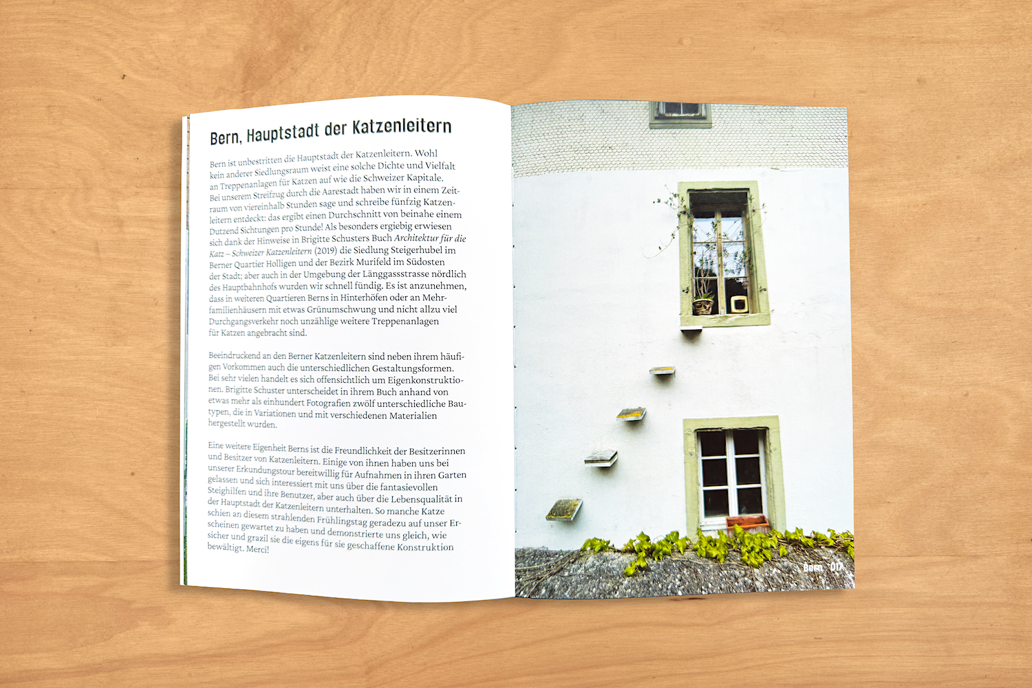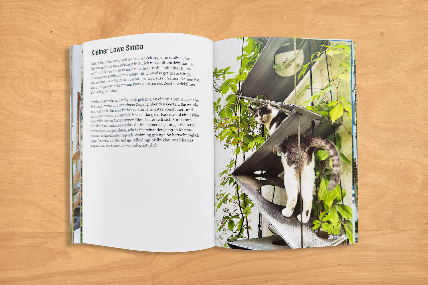 Der Fotograf Francisco PACO Carrascosa und der Kunsthistoriker Matthias Oberli haben sich in der ganzen Schweiz auf die Suche nach solchen Alltagsobjekten gemacht und diese im Bild festgehalten. Sie haben Besitzerinnen und Besitzer von Katzenleitern wie auch deren Konstrukteure befragt und sich nach den Gewohnheiten der Tiere im Umgang mit den Steighilfen erkundigt. Entstanden ist dadurch ein breites Panoptikum an Eindrücken, die der Grafiker Emanuel Tschumi zu einem visuellen Erlebnis verarbeitet hat.